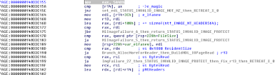 3) It then makes sure "e_lfanew" plus sizeof(nt!_IMAGE_NT_HEADERS64) does not overflow and does not exceed the input file size on disk.