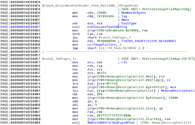 4) If the data at "e_lfanew" does not fit into one memory page, then function proceeds with allocating two pages and reattempts reading again.