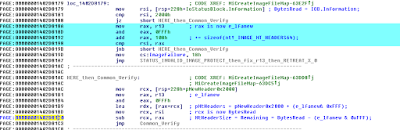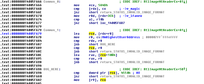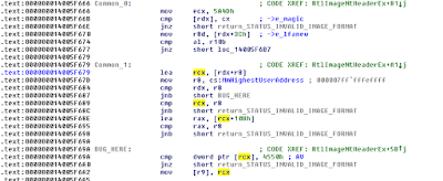 By the way, "MiCreateImageFileMap" improperly sanitizing "e_lfanew" against "SizeOfImage" also led to a memory corruption bug in the "nt!MiRelocateImage" function. I will explain that in the next blog post.