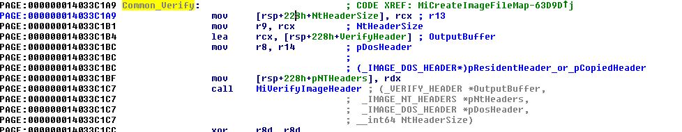 6) At this point, the "MiCreateImageFileMap" function proceeds with parsing the in-memory NT headers by calling "MiVerifyImageHeader".
