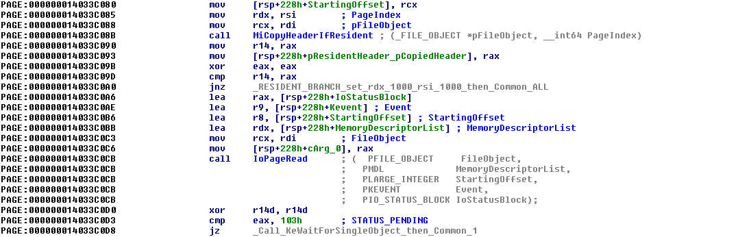 2) It then calls the "IoPageRead" function to read one page representing the input executable's DOS header and hopefully the NT file headers, from disk into memory, if it was not already cached in memory. Then, as expected, it checks to see whether the "e_magic" field is set to "MZ" (0x5A4D).